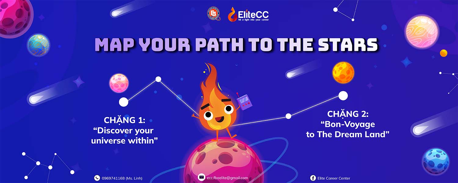 CAREER EXPLORE PROGRAM: "MAP YOUR PATH TO THE STARS" được các chuyên gia đánh giá là một hành trình đầy lý thú, trải qua các chặng sẽ giúp phi hành đoàn vượt nhảy qua các chướng ngại vật một cách dễ dàng. Vậy nên, nếu bạn cũng đang gặp phải những khó khăn trên thì còn chần chừ gì mà không đặt ngay một vé đến với chuyến bay vươn tầm vũ trụ nhỉ? Các tiếp viên của Elite Career Center đang rất nóng lòng chào đón các bạn đó. Chúc cho chuyến đi thành công rực rỡ!