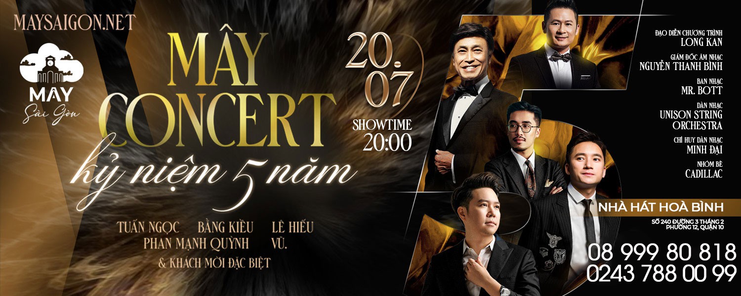 – Show diễn ở địa điểm Mây Concert Kỉ niệm 5 năm tại: Nhà hát Hòa Bình – 240 Đường 3 Tháng 2, phường 12, quận 10. Qúy khách lưu ý địa điểm tổ chức để sắp xếp thời gian và phương tiện di chuyển phù hợp.