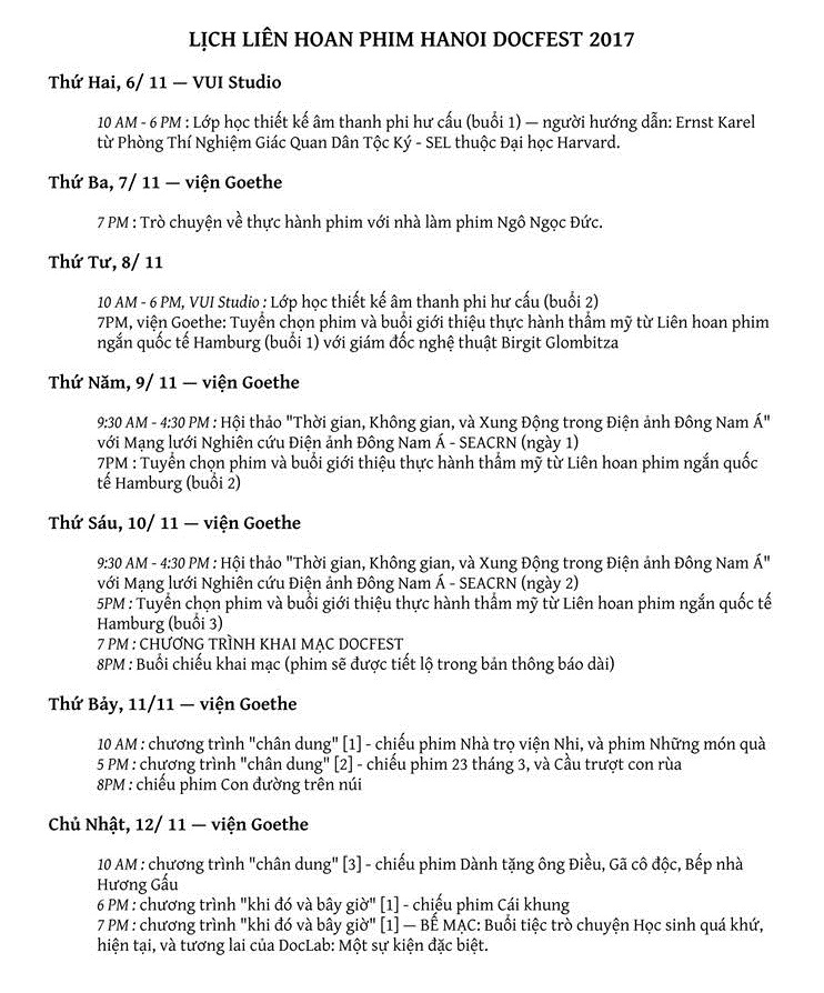 Đặc biệt, Liên hoan phim Hanoi DocFest 2017 sẽ kéo dài cả một tuần thay vì tập trung vào ba ngày cuối tuần như những năm trước. Sự thay đổi này là nhằm mở ra thêm các không gian điện ảnh cũng như trình diện một góc nhìn toàn cảnh hơn cho người xem.