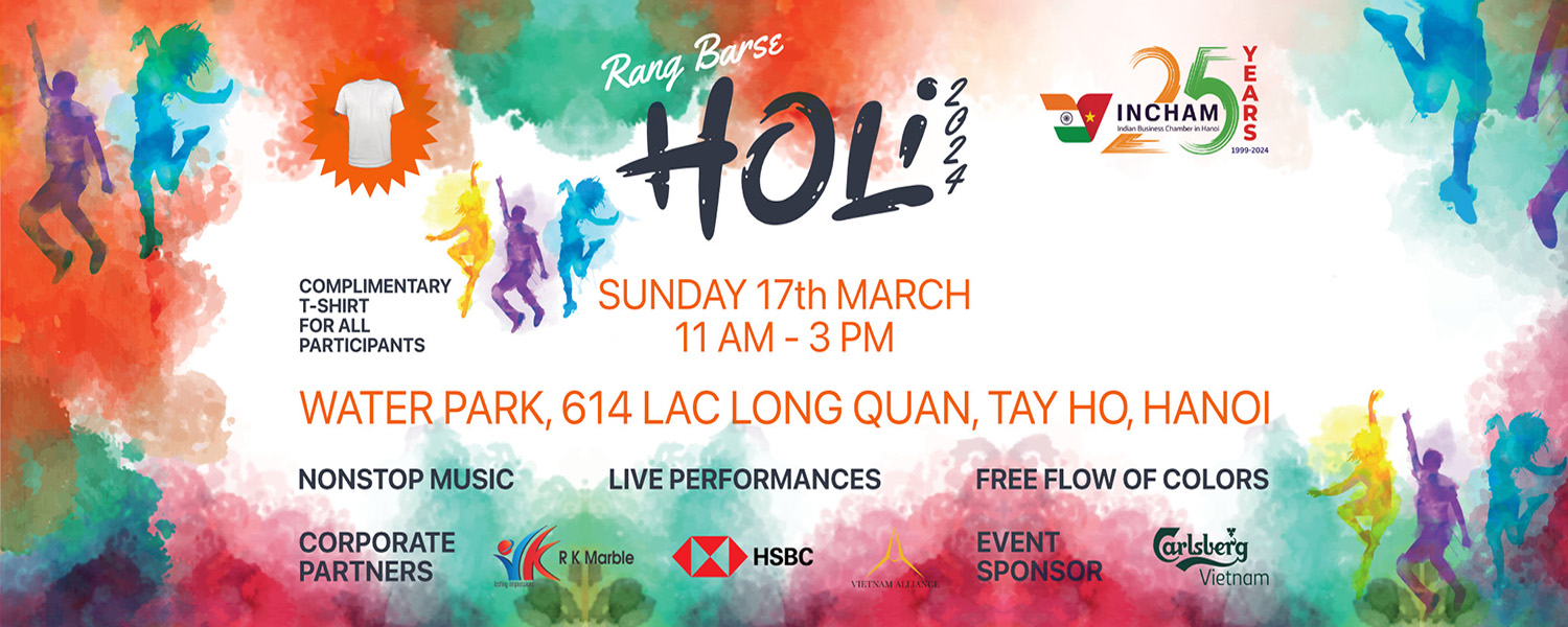 As a tradition, this year the Indian Business Chamber in Hanoi (INCHAM Hanoi) bring the celebration back to the calendar, with Rang Barse Holi 2024. This in order to promote cultural exchanges and understanding of Indian culture as well as create a traditional festival space for the community of Indian in Hanoi in particular and Vietnam in general. At Rang Barse Holi 2024, you can enjoy Indian and International cuisine, musical performance and also many other activities. We invite all Indian community and friends of India to come to the festival to meet others, play and laugh, forget and forgive, and repair broken relationships.