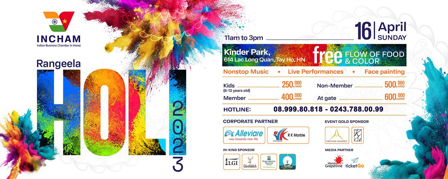 Sau 3 năm gián đoạn vì dịch Covid-19, năm nay Phòng thương mại Ấn Độ tại Hà Nội (INCHAM Hà Nội) tiếp tục tổ chức trở lại với cái tên Rangeela Holi 2023 nhằm thúc đẩy giao lưu và tìm hiểu văn hóa Ấn Độ, tạo không gian văn hóa truyền thống cho cộng đồng người Ấn Độ tại Hà Nội nói riêng và Việt Nam nói chung. Tại Rangeela Holi 2023, người tham gia có thể thưởng thức ẩm thực Ấn Độ và quốc tế, nhảy nhót theo các màn biểu diễn âm nhạc, hay thử vẽ henna và vẽ mặt, hai hoạt động truyền thống của Ấn Độ. Chúng tôi chào đón tất cả cộng đồng người Ấn Độ và bạn bè đến tham dự để cùng gặp gỡ và đùa vui, quên đi và tha thứ, và hàn gắn những mối quan hệ đã rạn nứt.