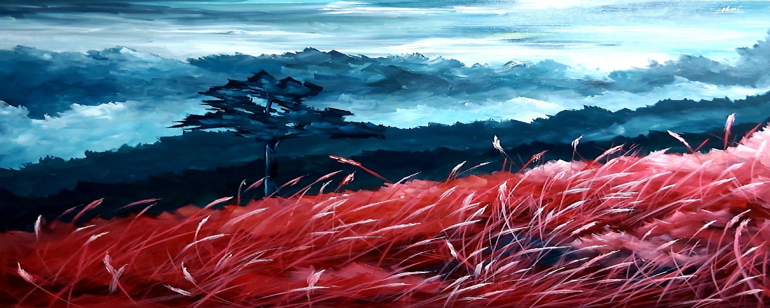 Được xem là một trong những họa phẩm xuất sắc nhất của họa sĩ Võ Bá Hiếu, màu sắc và cách biểu hiện của họa phẩm vượt qua ngoài sức tưởng tượng của thị giác. Sắc đỏ của cỏ lau, sắc xanh của trời, sắc xanh tím than của cây, của đồi cây, những ngọn núi đằng xa trập trùng một màu bàng bạc. Tất cả như bóc tách từng lớp màu nhưng lại thể hiện rõ ràng trong tâm khảm. “Lớp lớp mây cao đùn núi bạc”, bức vẽ như đua người xem lạc vào một cõi mộng.