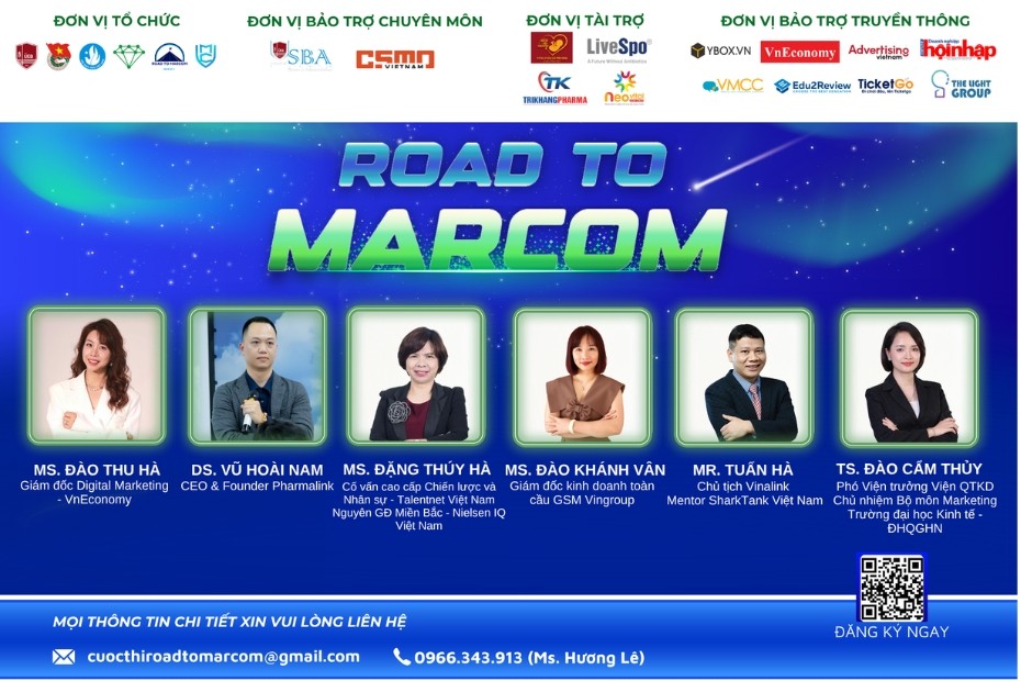 Vòng chung kết còn vô cùng vinh dự khi chào đón sự góp mặt của đội ngũ Ban giám khảo là những chuyên gia hàng đầu trong ngành Marketing và Truyền thông. Đội ngũ BGK chung kết ROAD TO MARCOM 2025 gồm Ms. Đào Khánh Vân - Giám đốc kinh doanh toàn cầu GSM Vingroup; chủ tịch Vinalink, mentor SharkTank VietNam - Mr. Tuấn Hà cùng Giám đốc khu vực miền Bắc của Nielsen Việt Nam - Ms. Đặng Thúy Hà; DS. Vũ Hoài Nam - CEO&Founder PharmaLink; Ms. Đào Thu Hà - Giám đốc Digital Marketing VnEconomy và TS. Đào Cẩm Thủy - Phó Viện trưởng Viện Quản trị Kinh doanh, chủ nhiệm bộ môn Marketing trường Đại học Kinh tế - ĐHQGHN. Với kinh nghiệm và kiến thức sâu rộng, Ban giám khảo sẽ đánh giá công tâm và đưa ra những nhận xét giá trị, góp phần tìm ra gương mặt xuất sắc nhất.