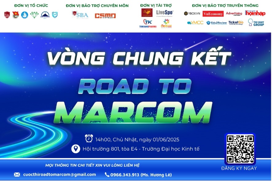 Cuộc thi học thuật uy tín về Marketing dành cho sinh viên toàn quốc - ROAD TO MARCOM với chủ đề độc đáo: Marcom for Vietnamese Health sẽ chính thức khép lại hành trình tìm kiếm những gương mặt marketing tài năng với Vòng Chung kết được tổ chức vào lúc 14h00 ngày 01 tháng 6 năm 2025, tại Hội trường 801, Trường Đại học Kinh tế – ĐHQGHN. Sự kiện hứa hẹn sẽ mang đến những màn tranh tài đỉnh cao và kịch tính, tìm ra quán quân xứng đáng cho mùa giải năm nay.