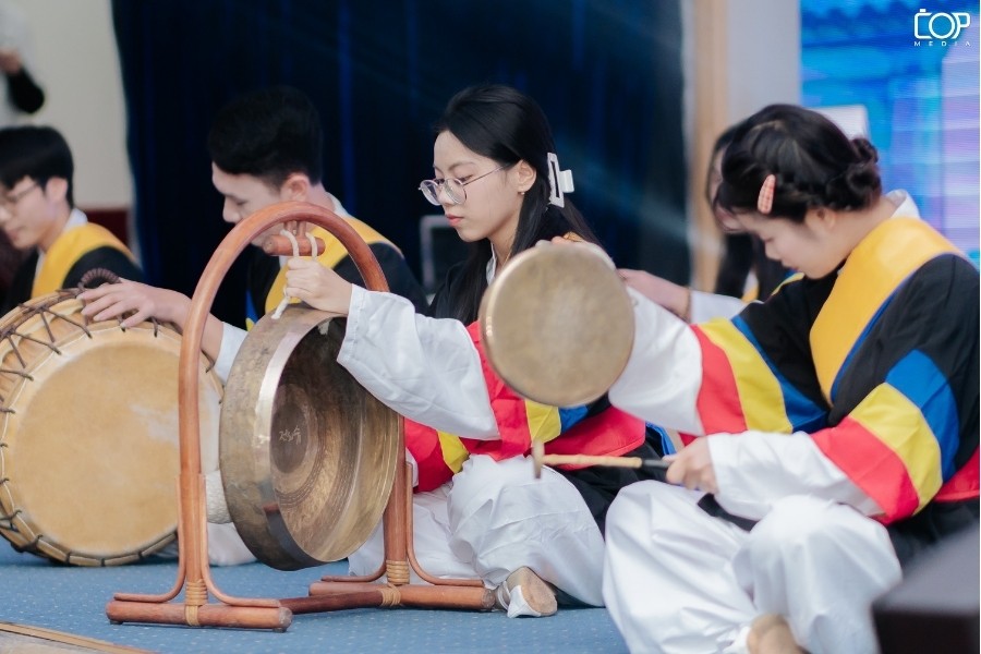 Bên cạnh các tiết mục đến từ sinh viên trong khoa, chương trình còn ghi dấu ấn với phần trình diễn của Samulnori Club of USSH. Tiết mục mang đậm âm hưởng truyền thống Hàn Quốc với những nhịp trống mạnh mẽ, dồn dập, tạo nên không gian nghệ thuật vừa sôi động vừa giàu bản sắc. Sự kết hợp hài hòa giữa âm thanh và nhịp điệu đã thu hút sự chú ý của khán giả, đồng thời mang đến một sắc màu văn hóa đặc biệt, góp phần làm phong phú thêm nội dung và cảm xúc cho đêm văn nghệ.