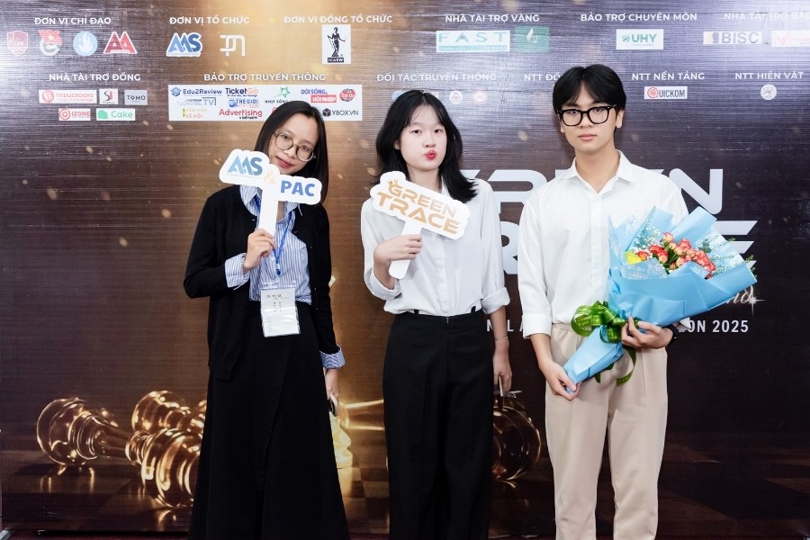 Quán quân của PAC 2025 là Lê Gia Bảo (đứng giữa), Á quân Hoàng Minh Anh (bên phải) và Quý quân Lê Minh Nguyệt (bên trái) đã xuất sắc hoàn thành phần thi của minh.