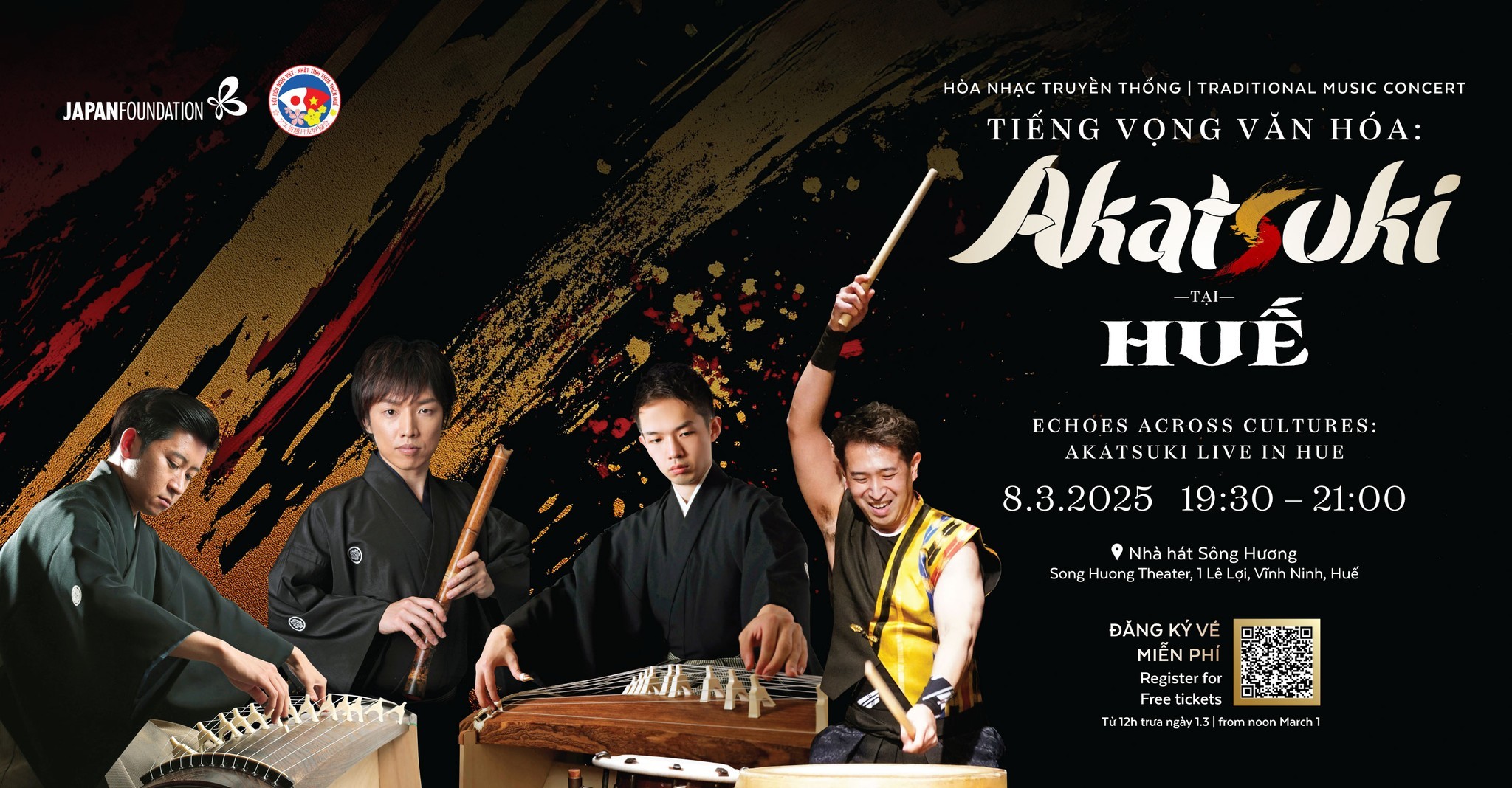 For the first time in Hue, the AKATSUKI ensemble from Japan will present a unique musical night where the traditional sounds of koto, shakuhachi, and Wadaiko drums blend seamlessly in an artistic and emotional atmosphere.