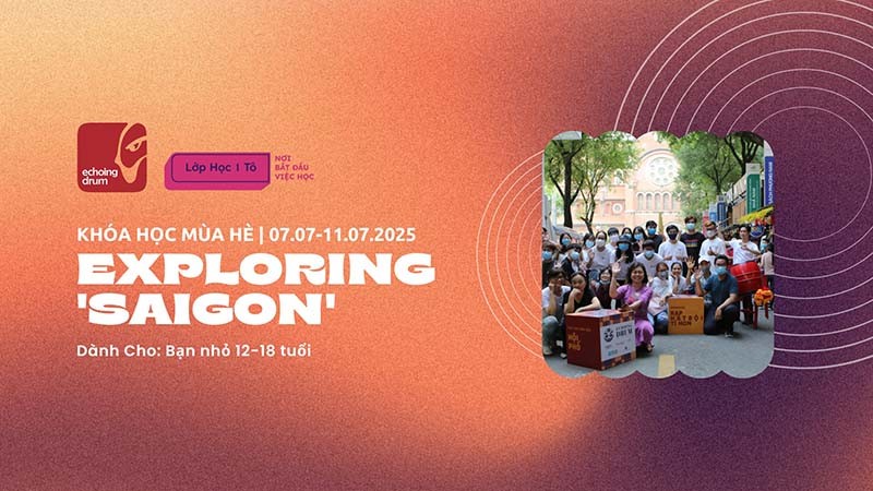 Exploring 'Saigon' là Khóa Học Mùa Hè của Echoing Drum / Vang Vọng Trống Chầu, do đội ngũ Echoing Trip / Đi Để Học thiết kế cho các bạn nhỏ từ 12-18 tuổi. Khóa Học gồm 5 chuyến field-trip và 5 workshop đi kèm. Mỗi chuyến đi, mỗi workshop sẽ cung cấp một mảnh ghép đa sắc, giúp các bạn khám-phá, học-hỏi và tái-tạo lại kiến thức, góc nhìn lịch sử-văn hóa-xã hội-kinh tế của thành phố lớn nhất nước: Gia Định-Saigon-TP.Hồ Chí Minh.