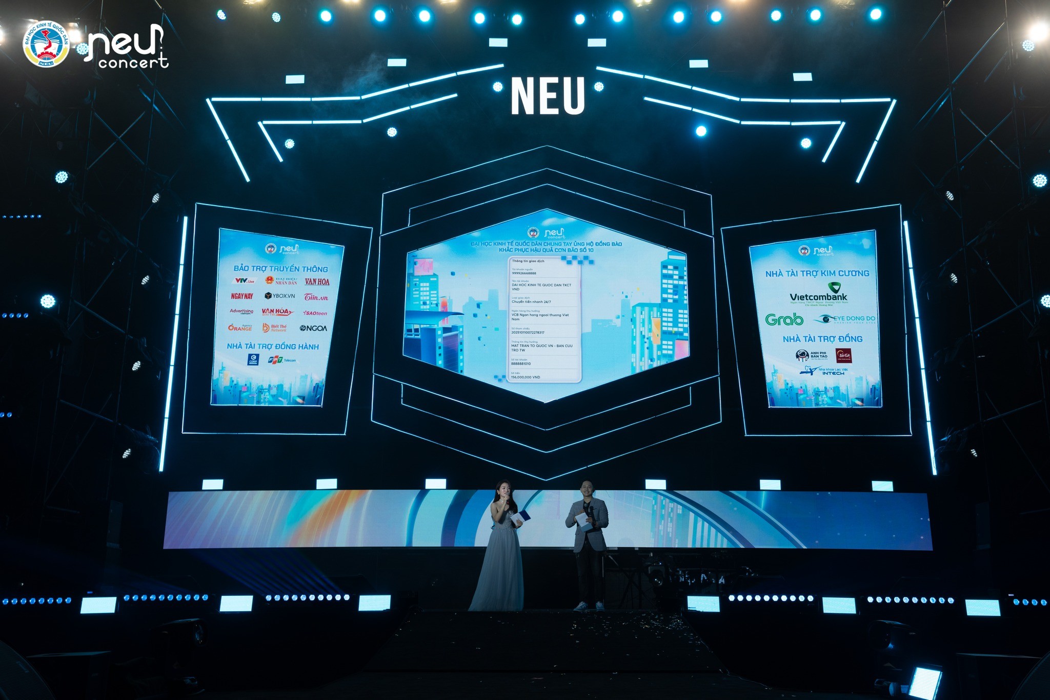 Qua NEU Concert 2025. Đại học Kinh tế Quốc dân cũng muốn được lan tỏa yêu thương, ủng hộ đồng bào vượt qua bão lũ. Để hưởng ứng lời kêu gọi của Đoàn Chủ tịch Uỷ ban Trung Ương Mặt trận Tổ quốc Việt Nam, tại đại nhạc hội NEU Concert 2025, Đại học Kinh tế Quốc dân đã tổ chức hoạt động quyên góp trực tiếp để ủng hộ đồng bào khắc phục hậu quả của cơn bão số 10. Giám đốc Đại học Kinh tế Quốc dân PGS.TS Bùi Huy Nhượng đã phát biểu trước toàn thể sinh viên NEU: “Bên cạnh lễ hội âm nhạc NEU Concert 2025 thì hãy biến hôm nay thành lễ hội yêu thương, lễ hội của sự chia sẻ”. Hoạt động trên đã ghi nhận sự hưởng ứng tích cực của toàn thể đại biểu và sinh viên NEU và số tiền quyên góp 156 triệu đồng đã được chuyển tới Mặt trận Tổ quốc Việt Nam. Thông qua hoạt động trên, mong rằng tinh thần đoàn kết, giúp đỡ và yêu thương sẽ luôn được nuôi dưỡng trong tim mỗi NEUers bởi những đóng góp nhỏ đều trở thành nguồn sức mạnh to lớn.