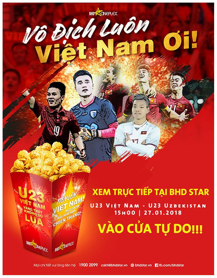 Đội tuyển U23 Việt Nam đã tạo nên một chiến tích khó tin mà phải nói là kỳ tích của kỳ tích khi hiên ngang đánh bại U23 Qatar giành tấm vé tiến thẳng vào vòng chung kết U23 Châu Á. Và để hòa chung niềm vui, niềm tự hào dân tộc cũng như cổ vũ cho các chiến binh U23 Việt Nam tiếp tục viết tiếp câu chuyện cổ tích thần kì trong trận chung kết gặp U23 Uzbekistan, BHD Cineplex đã quyết định tổ chức một buổi tường thuật trực tiếp tại 7 cụm rạp BHD Star TP.HCM và Hà Nội vào lúc 15h ngày 27.01.2018. Đặc biệt sự kiện vào cửa hoàn toàn miễn phí cho tất cả khán giả yêu bóng đá.