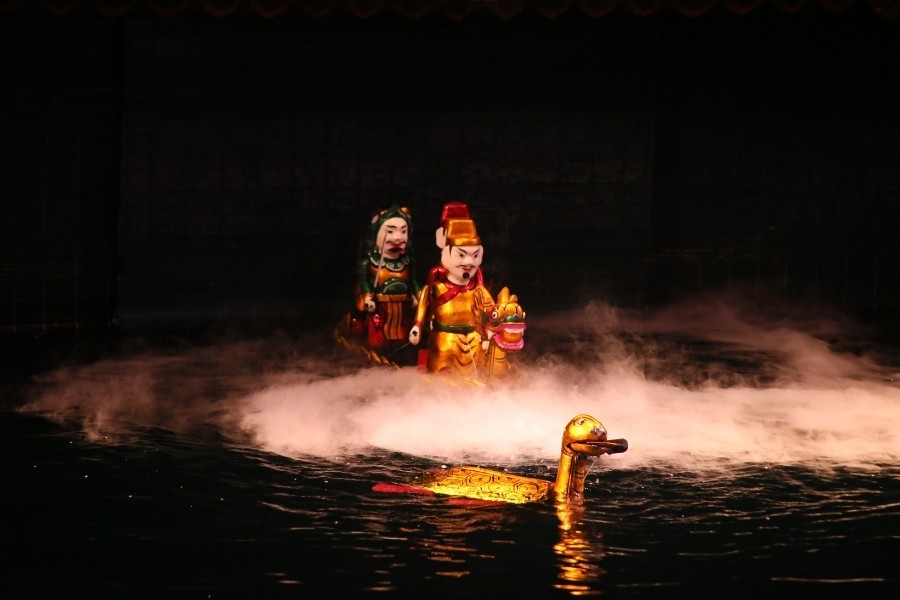 Ảnh 1: Các nhân vật rối nước xuất hiện trong vở diễn tại Nhà hát múa rối Thăng Long.