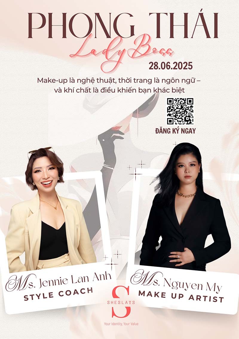 + Ms. Jennie Lan Anh – Với hơn 10 năm kinh nghiệm giữ vai trò quản lý cấp cao tại các khách sạn 5 sao như Wink Hotel, New World, Caravelle, Pullman... Hiện tại, Jennie là một **Style Coach **đồng hành cùng phụ nữ trên hành trình xây dựng phong thái tự tin, thanh lịch và đầy bản sắc.