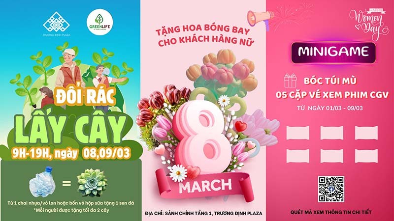 Ngày Quốc tế Phụ nữ 8/3 không chỉ là dịp để tôn vinh những người phụ nữ tuyệt vời mà còn là cơ hội để chúng ta cùng chung tay lan tỏa những giá trị tốt đẹp đến cộng đồng và môi trường. Hưởng ứng tinh thần ấy, Trương Định Plaza tổ chức sự kiện "Phụ nữ rạng rỡ, Trái đất xanh tươi!", kết hợp hoạt động tôn vinh phụ nữ với chiến dịch "Đổi rác lấy cây" nhằm lan tỏa thông điệp sống xanh, yêu thiên nhiên.