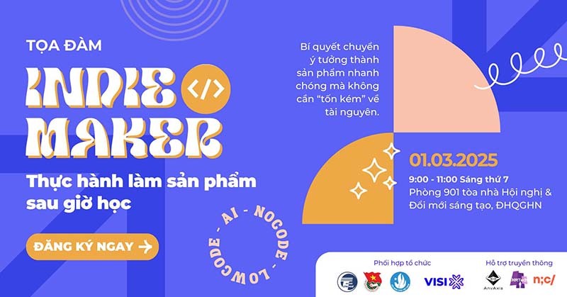Nhằm mang đến cho sinh viên một cái nhìn sâu sắc và thực tiễn về văn hóa indie maker – từ cách cân bằng giữa học tập và thực hành, tận dụng các công cụ hiện đại đến xây dựng cộng đồng hỗ trợ, mở ra lộ trình hiện thực hóa ý tưởng thành sản phẩm thực tế sau giờ học. Đoàn Thanh niên - Hội Sinh viên Trường Đại học Công nghệ và VISI - Vườn ươm Khởi nghiệp Đổi mới Sáng tạo, Đại học Quốc gia Hà Nội phối hợp tổ chức Tọa đàm "Văn hóa Indie Maker: Thực hành làm sản phẩm sau giờ học".
