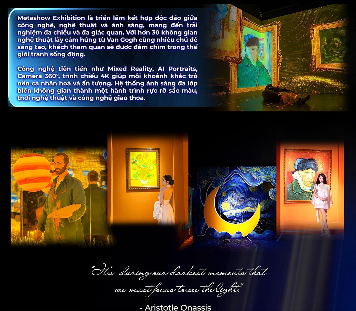 Triển lãm là sự kết hợp đặc biệt giữa 3 yếu tố: công nghệ, nghệ thuật và ánh sáng nhằm mang lại cho khách tham quan trải nghiệm đa chiều, đa giác quan đặc biệt ấn tượng.