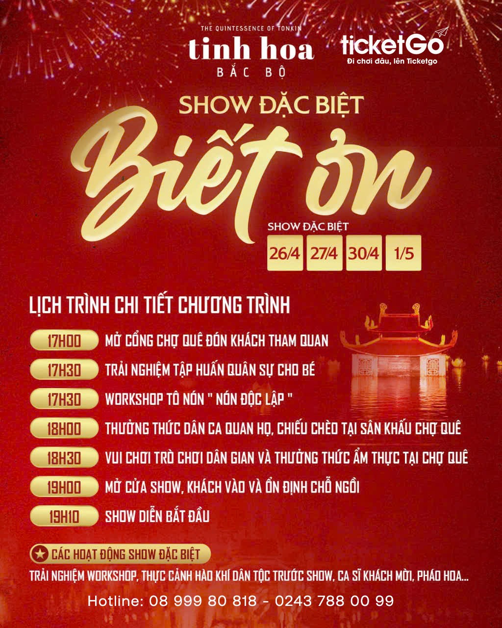 Đặc biệt, trong tháng 4 này Tinh hoa Bắc Bộ sẽ có suất diễn đặc biệt mừng ngày Thống Nhất - SHOW ĐẶC BIỆT BIẾT ƠN vào các ngày: 26/04, 27/04, 30/04 và 01/05.