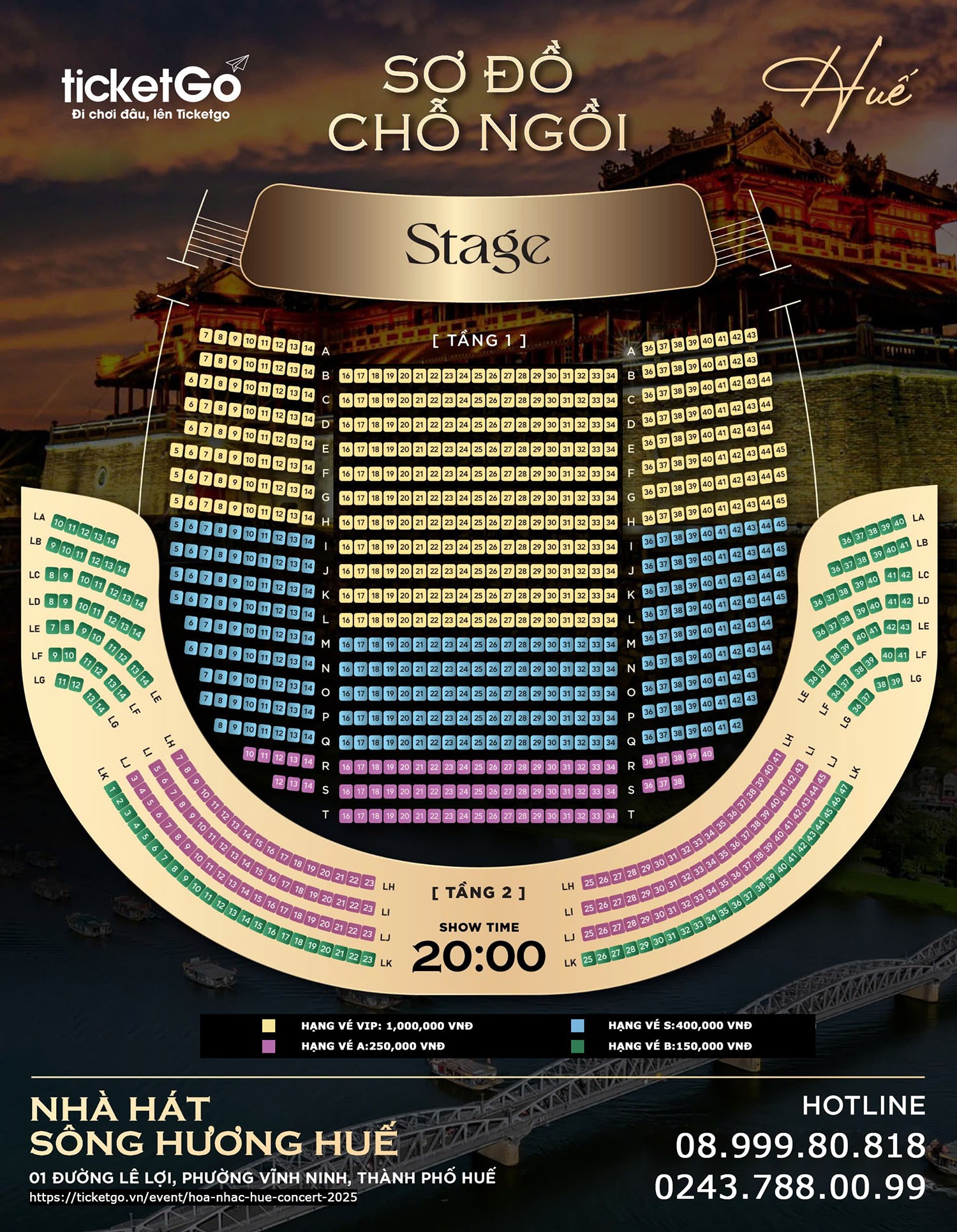 (Physical tickets will be distributed by the Organizing Committee at the event location in Hue starting 2 days before the event. Please present the ticket purchase confirmation email containing the Booking Code sent by Ticketgo in order to exchange for a physical ticket. The latest time for ticket exchange is 2 hours before the show.)