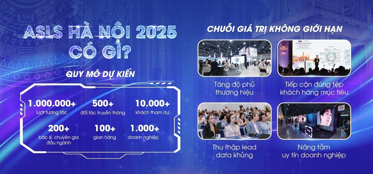 Với 2 phòng hội thảo, 40 báo cáo chuyên đề, sự tham gia của hơn 200 thương hiệu và 100 gian hàng công nghệ thẩm mỹ, ASLS Hà Nội 2025 tạo ra một không gian lý tưởng để cập nhật kiến thức, khám phá công nghệ mới nhất và kết nối với các đồng nghiệp, đối tác tiềm năng trong ngành. Sự kiện khẳng định vị thế là nền tảng học thuật hàng đầu, đóng góp vào sự phát triển mạnh mẽ của ngành thẩm mỹ trong tương lai.