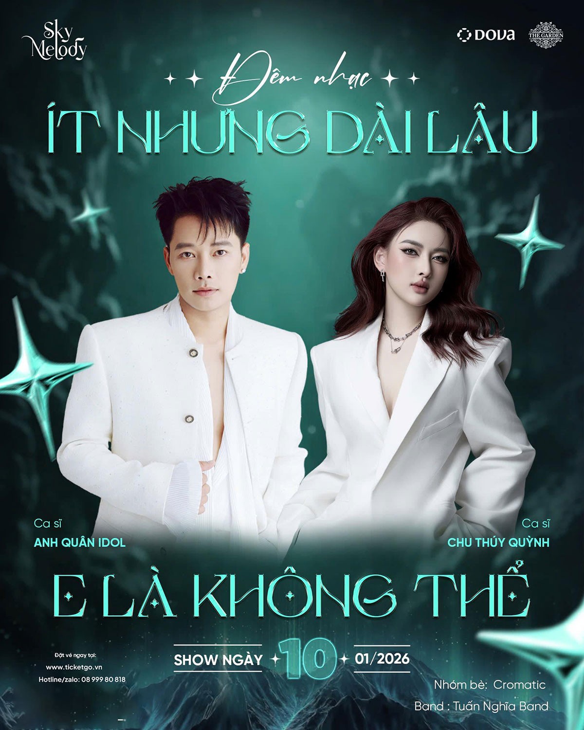 Live show Anh Quân Idol – Chu Thúy Quỳnh: Em là không thể & Ít nhưng dài lâu ngày 10.01.2026 là một trong những đêm nhạc được mong chờ nhất đầu năm, nơi khán giả được hòa mình vào không gian cảm xúc sâu lắng, lãng mạn và đầy nghệ thuật. Với giọng hát nội lực của Anh Quân kết hợp cùng nét ngọt ngào, tinh tế của Chu Thúy Quỳnh, chương trình hứa hẹn mang đến trải nghiệm âm nhạc độc nhất dành cho những ai yêu thích ballad, acoustic và những ca khúc đang “làm mưa làm gió”.