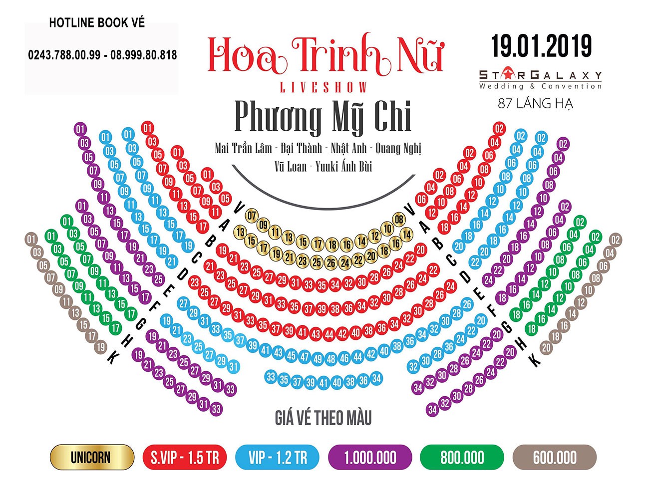 Giá vé đêm nhạc Hoa Trinh Nữ: 500.000 VNĐ - 800.000 VNĐ - 1.000.000 VNĐ - VIP 1.200.000 VNĐ - SVIP 1.500.000 VNĐ - Unicorn 2.000.000 VNĐ
