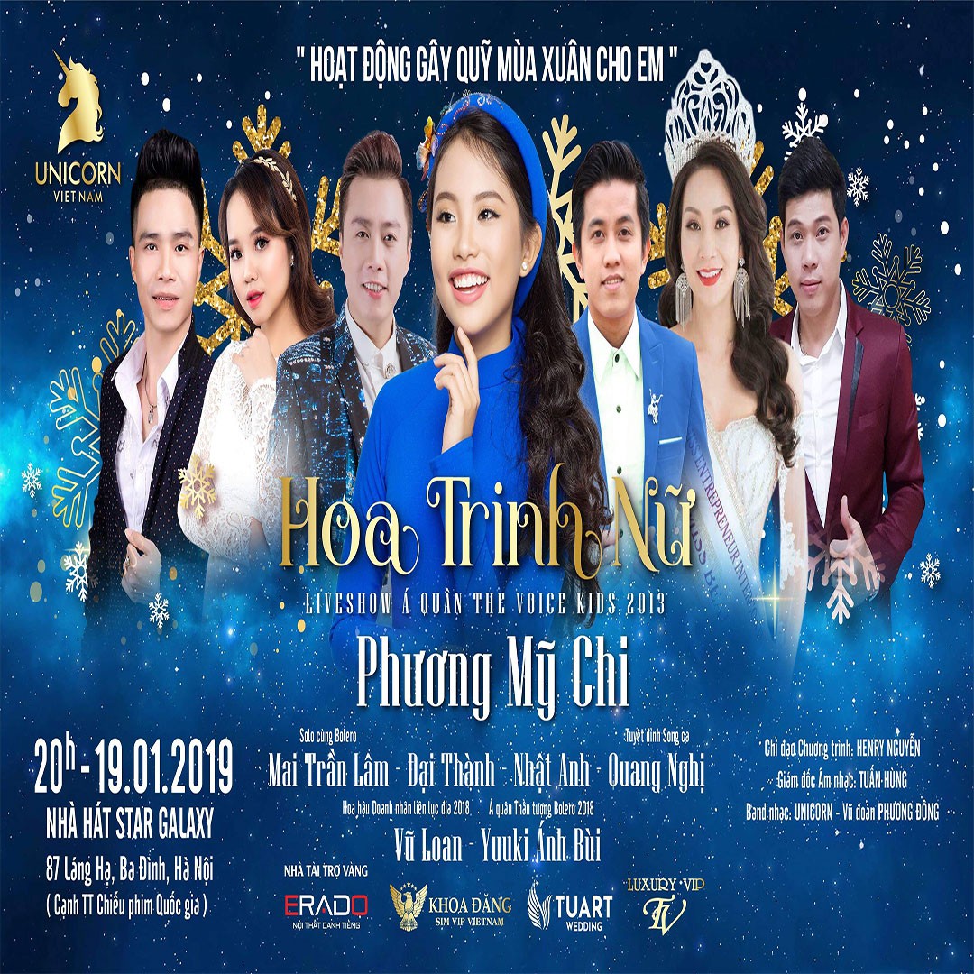 Sự kết hợp tuyệt vời của Á Quân The Voice Kid Phương Mỹ Chi và Á Quân Thần tượng Bolero Yuu Ki Ánh Bùi, cùng 4 Hoàng tử khách mời đặc biệt sẽ làm nên đêm nhạc tuyệt vời Chúc Mừng Năm Mới 2019 đồng thời cũng sẽ là hoạt động gây quỹ cho trẻ em nghèo có một cái tết ấm áp. Đêm nhạc Hoa Trinh Nữ sẽ được diễn ra tại Nhà hát Star Galaxy - 87 Láng Hạ. Đến với đêm nhạc, khán giả sẽ được chìm đắm trong một không gian âm nhạc hoàn toàn khác biệt bởi dàn âm thanh ánh sáng đẳng cấp. Hứa hẹn sẽ mang đến cho khán giả những trải nghiệm vô cùng tuyệt vời.