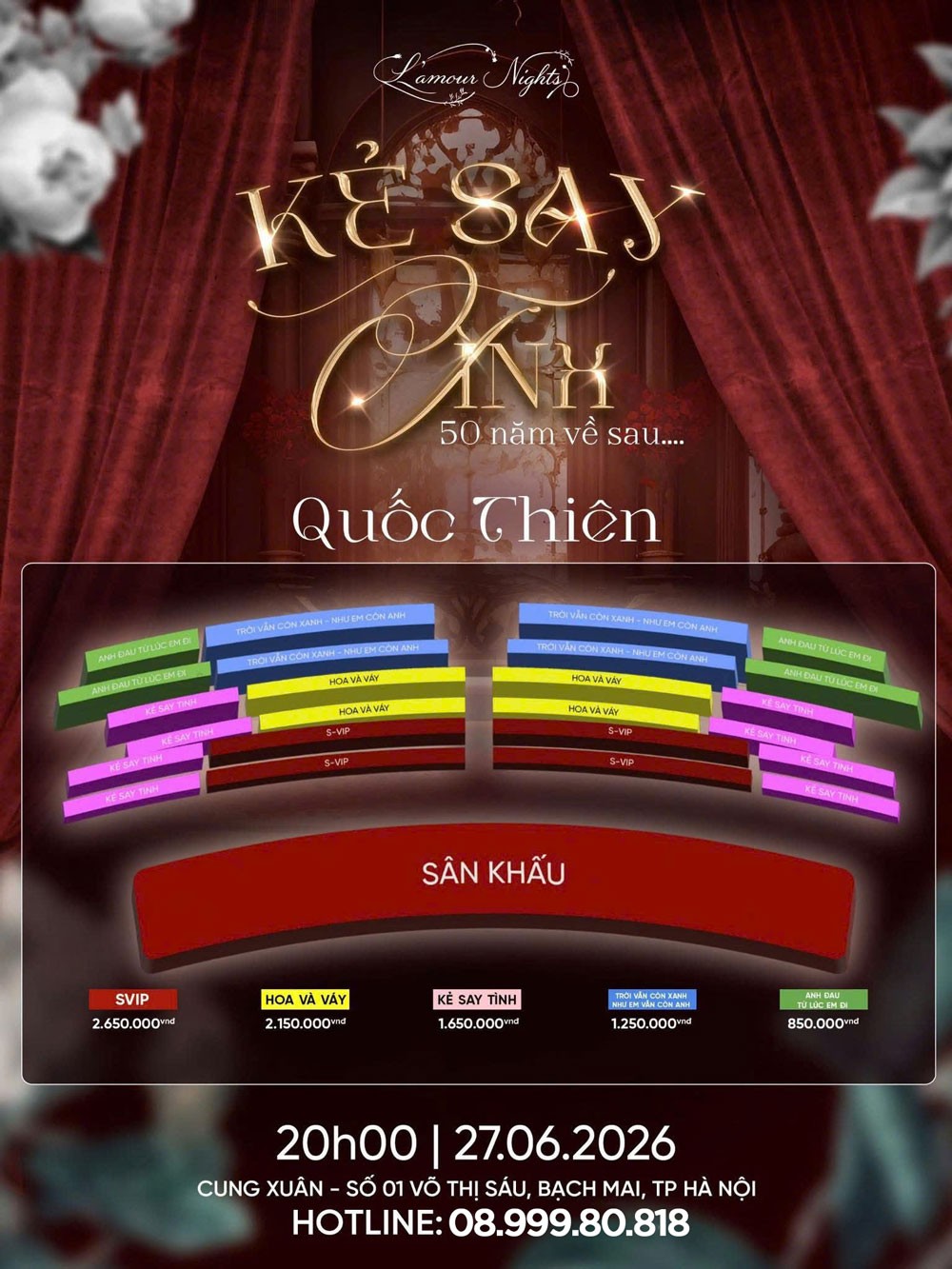 Đúng như tên gọi của đêm nhạc, Liveshow Quốc Thiên: Kẻ Say Tình 50 năm Về Sau muốn đưa bạn đắm chìm trong những cung bậc thăng hoa nhất của tình yêu qua tiếng hát. Tại không gian nghệ thuật tinh tế của Cung Xuân, giọng hát nội lực đầy tự sự và nồng nàn của ca sĩ Quốc Thiên sẽ đóng vai trò người dẫn lối, trực tiếp “chạm” vào từng tầng cảm xúc. Từ những bản ballad trữ tình sở trường đến những giai điệu mới mẻ, Quốc Thiên sẽ là sợi dây kết nối tâm hồn, đưa ta đi qua mọi miền ký ức và những rung động chân thật nhất.