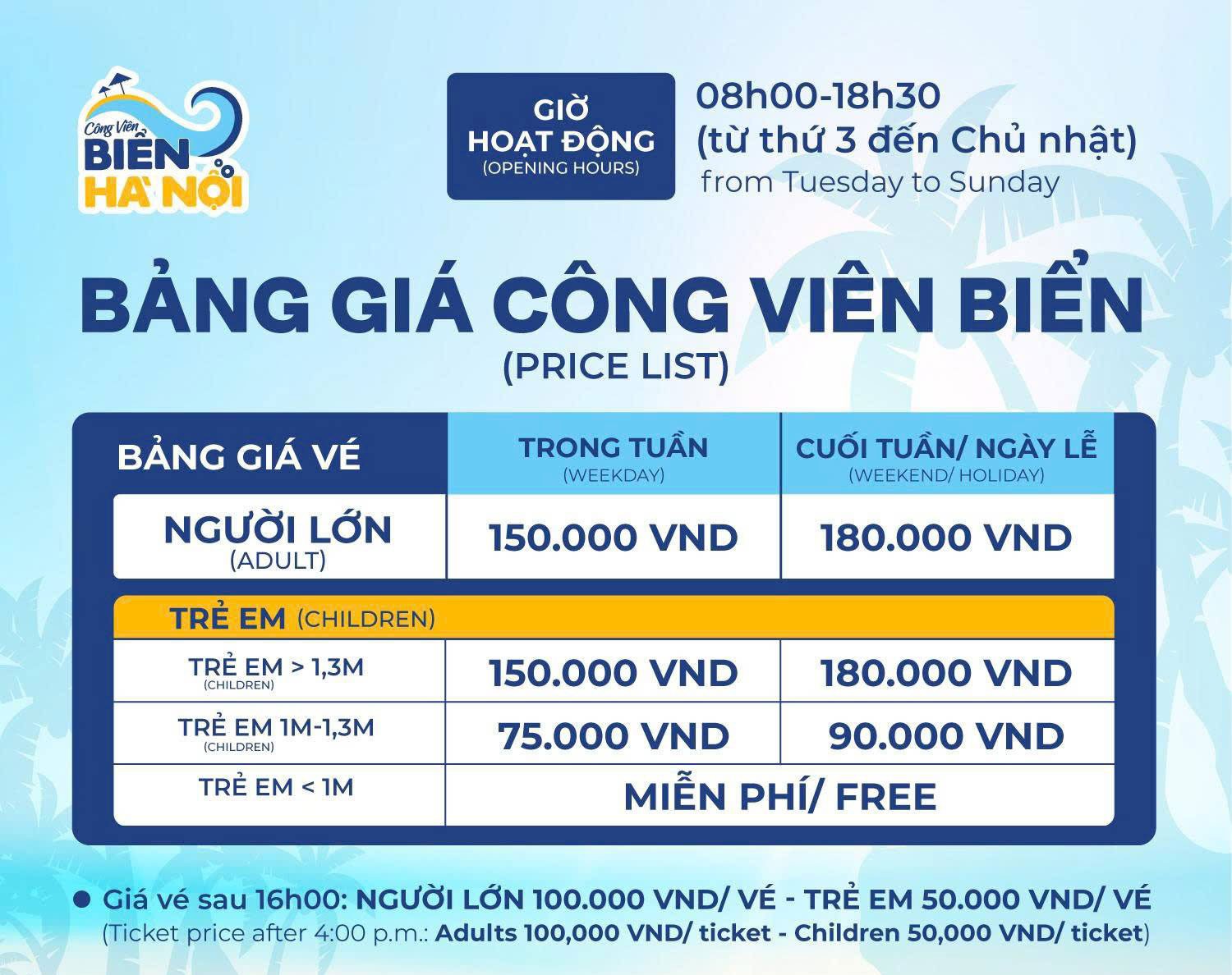 Lưu ý: không mang đồ ăn bên ngoài vào trong khu công viên biển, các trò chơi mạo hiểm sẽ dừng lúc 17h.