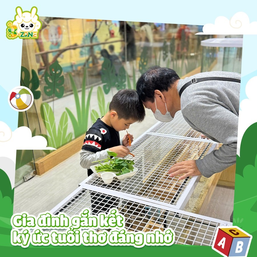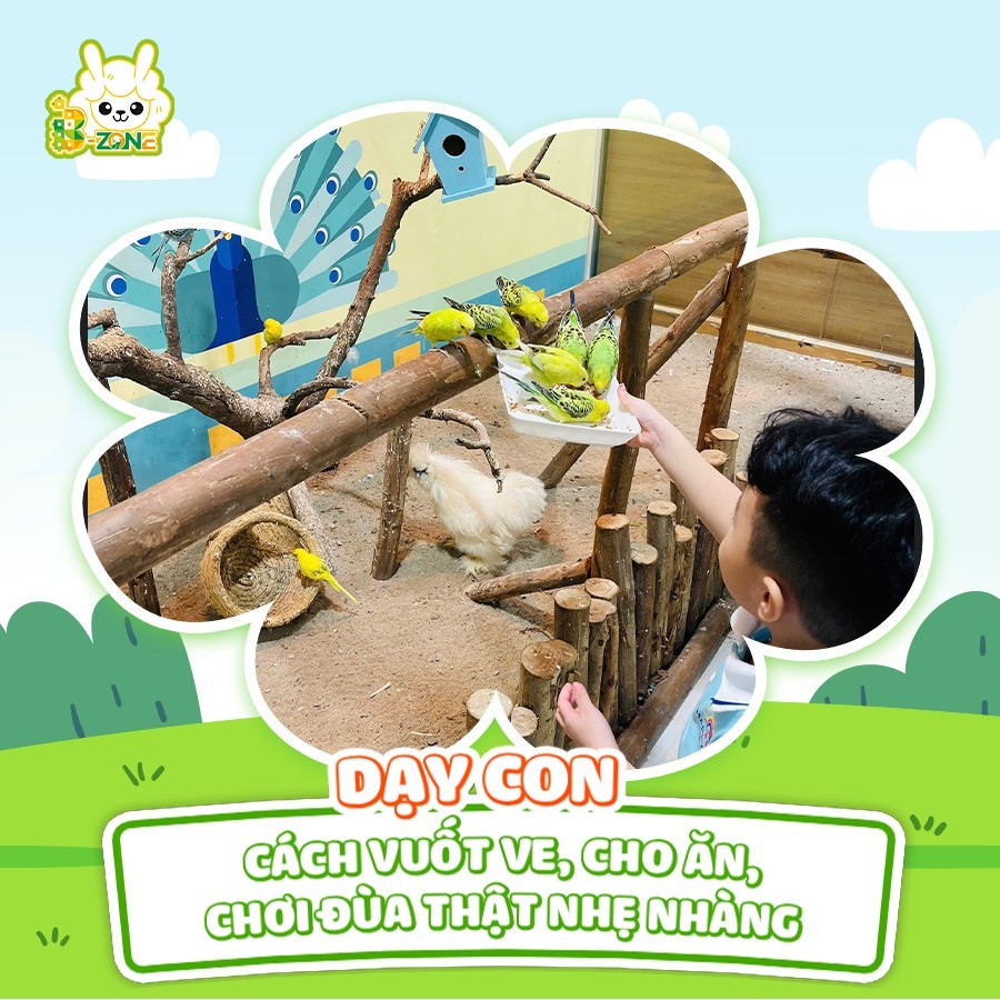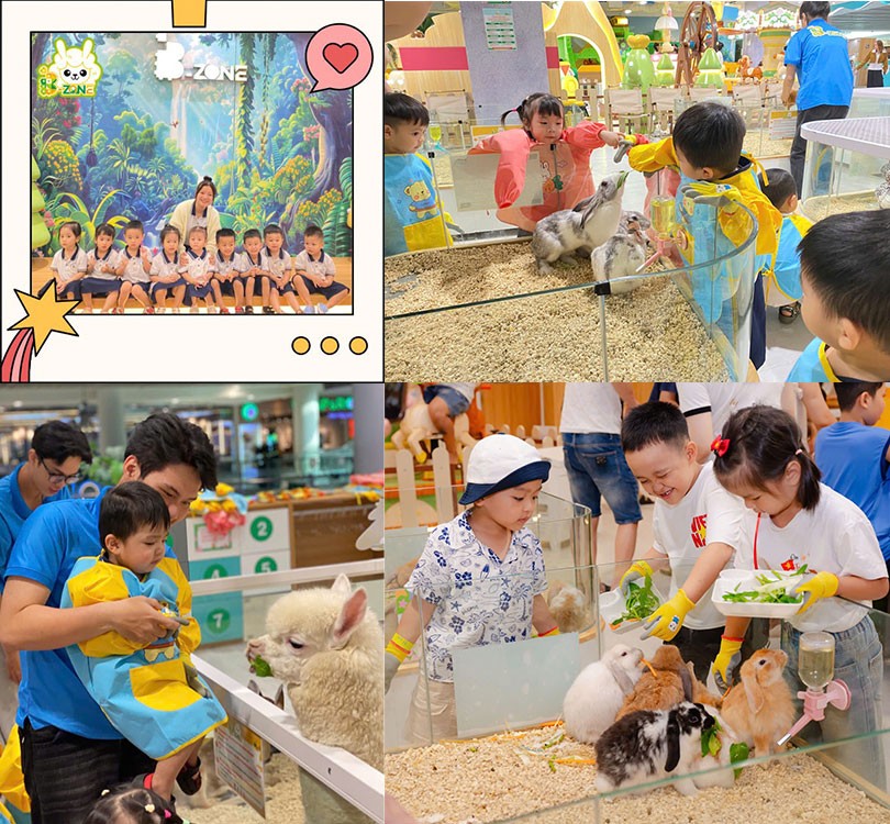 B-Zone mang một không gian giúp các bé có thể thoả thích vui chơi, tương tác trực tiếp và tìm hiểu về các bạn động vật dễ thương như: Lạc đà Alpaca, hươu sao, cừu trắng, dê lùn, chuột lang, chuột hamster, chim vẹt, thỏ trắng, thỏ tai cụp, nhím kiểng, gà tre, gà sư tử, dông cát....