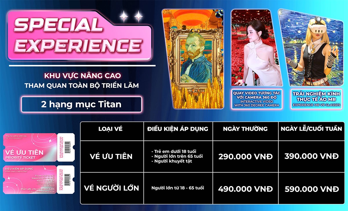 SPECIAL-L | TRẢI NGHIỆM SPECIAL: Tham quan toàn bộ triển lãm với 30 chủ đề lớn nhỏ và 2 hạng mục Titan: Trải nghiệm kính MR, quay video camera 360 độ.