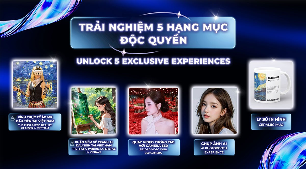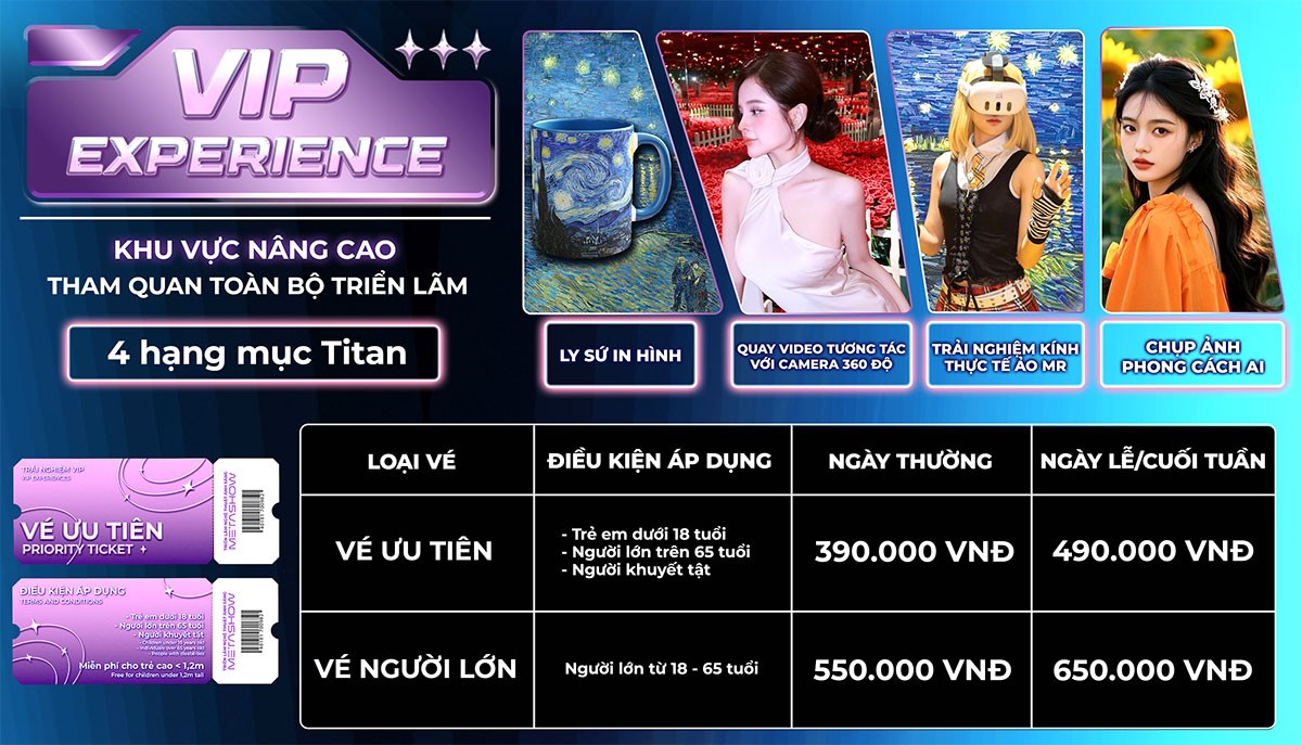 VIP-L | TRẢI NGHIỆM VIP Tham quan toàn bộ triển lãm và 4 hạng mục Titan: Trải nghiệm kính MR ( MR experience), Chụp ảnh AI ( AI Photo), Quay video với camera 360 độ ( Camera 360), Ly sứ in hình (Ceramic Mug).