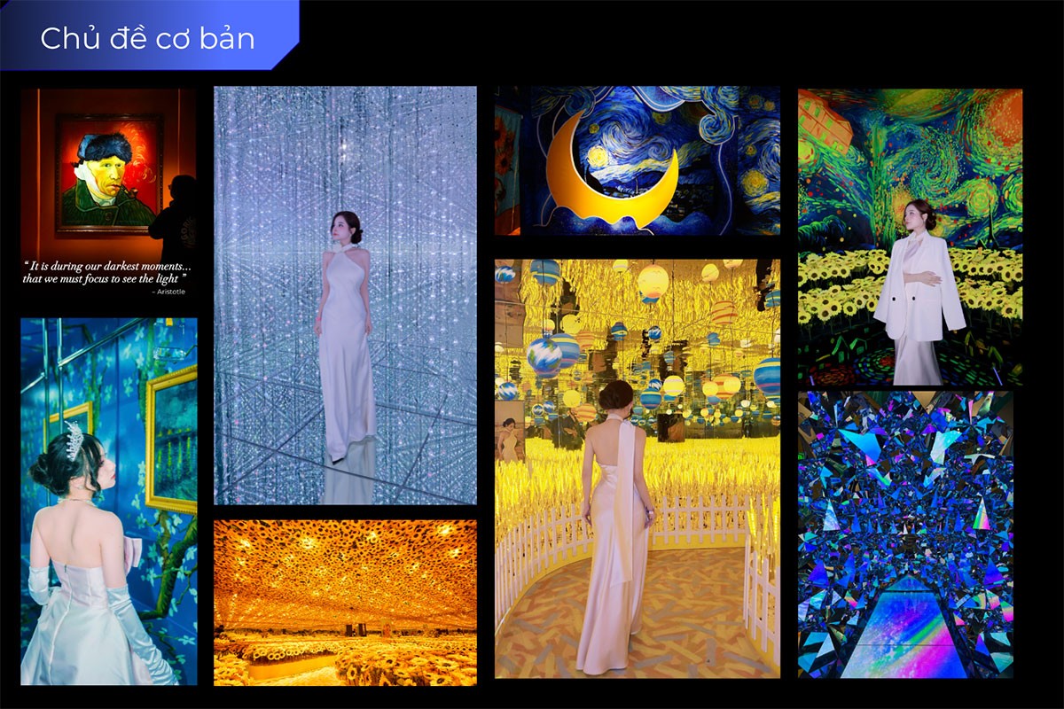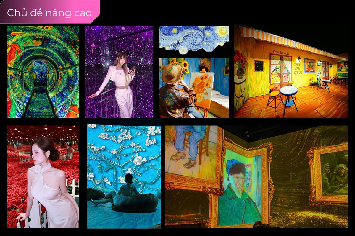 Triển lãm với hơn 30 chủ đề như: Kính vạn hoa, Biển hoa hồng, Dải ngân hà, Van Gogh, Cung điện gương, Thị trấn AI, Vũ trụ cánh đồng lúa mì, Biển hướng dương, Mắt kim cương, Phòng chiếu 4K…