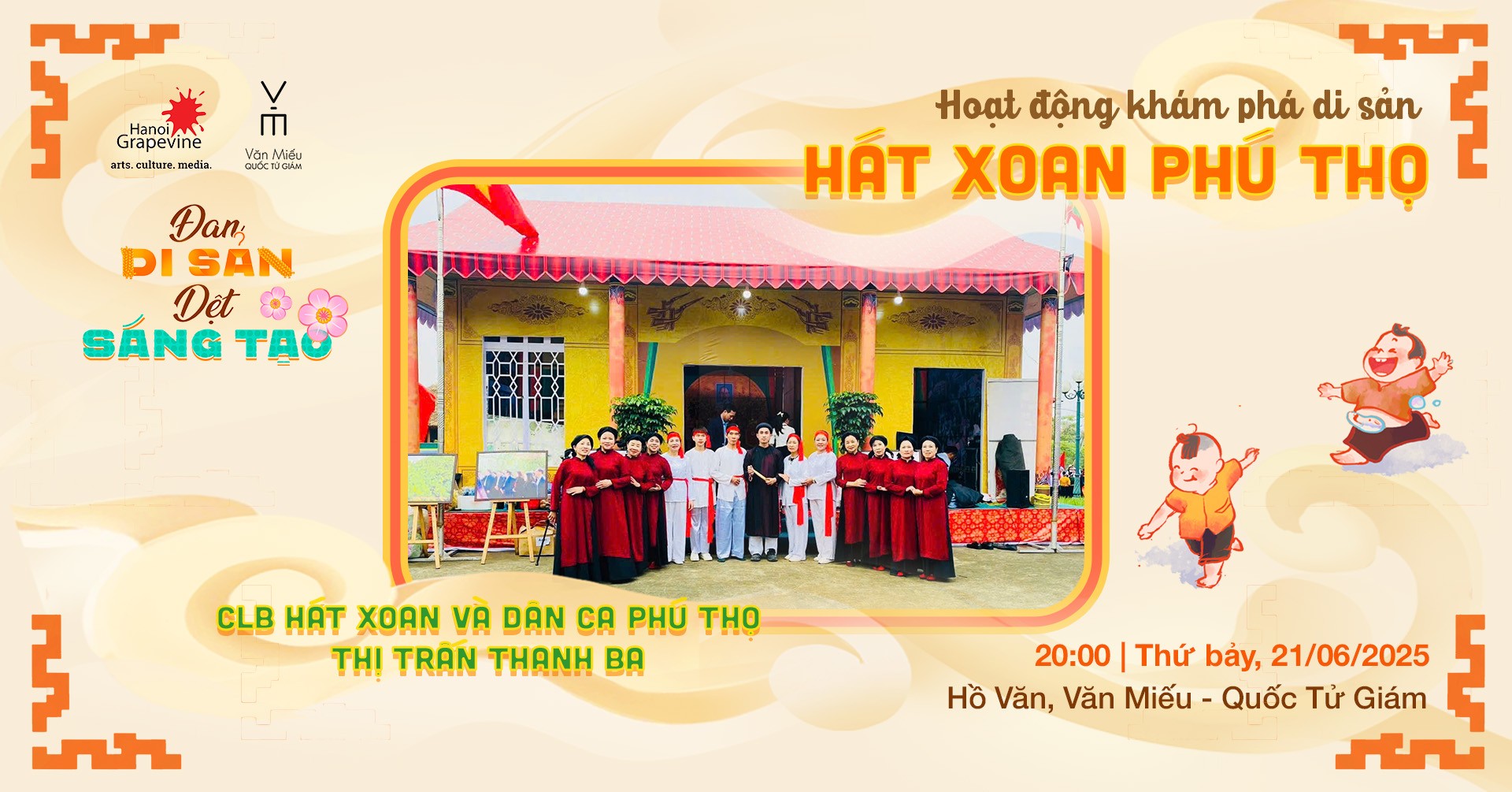 Nếu bạn yêu thích nghệ thuật dân gian và muốn trải nghiệm các làn điệu hát Xoan cổ truyền từ Phú Thọ, hoặc chỉ đơn giản là đang tìm kiếm một hoạt động văn hóa thú vị cuối tuần này, mời bạn đến với Hồ Văn để gặp gỡ các nghệ nhân đến từ CLB hát Xoan và dân ca Phú Thọ Thị trấn Thanh Ba! Tại sự kiện, khán giả cũng sẽ có cơ hội giao lưu và thực hành một số làn điệu xoan cổ truyền do chính các nghệ nhân từ CLB hướng dẫn. Hẹn gặp bạn tại Hồ Văn cuối tuần này.
