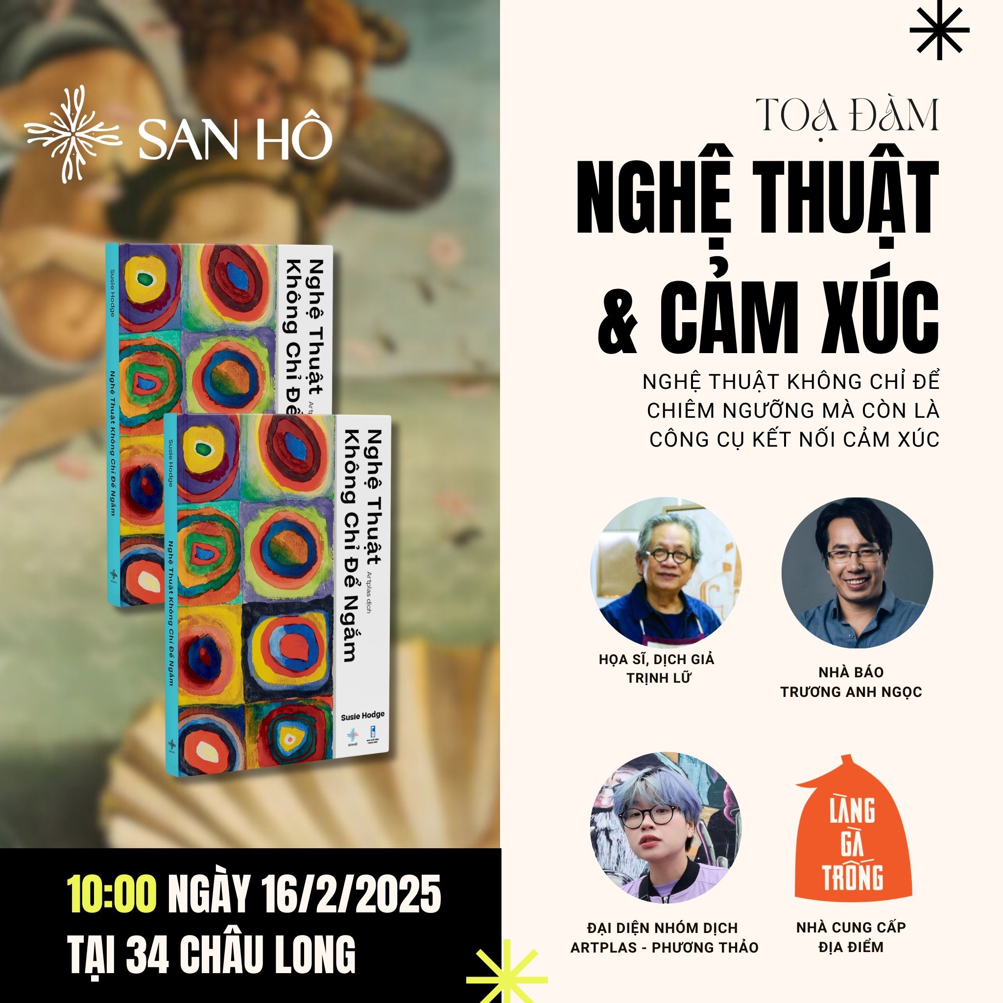 Buổi tọa đàm "Nghệ thuật & Cảm xúc" sẽ xoay quanh những chia sẻ từ cuốn sách "Nghệ thuật không chỉ để ngắm" của Susie Hodge – một trong những cây viết nghệ thuật hàng đầu đương thời. Cuốn sách giúp ta nhận ra rằng nghệ thuật không hề xa cách hay khó hiểu – nó dành cho tất cả mọi người và có thể chạm đến cảm xúc của bất kỳ ai.