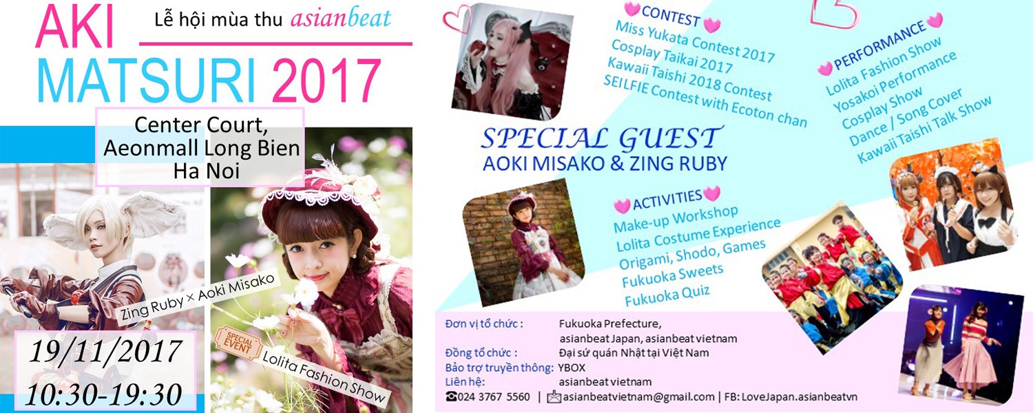 Kỷ niệm tròn 5 năm thành lập asianbeat vietnam, đáp lại sự ủng hộ và yêu mến của hơn 5 vạn fan, asianbeat, phối hợp với Đại sứ quán Nhật Bản tại Việt Nam, tổ chức AKI MATSURI 2017 tại TTTM Aeonmall Long Biên, Hà Nội vào ngày 19/11, tạo sân chơi lý thú cho các bạn trẻ yêu văn hoá Nhật.