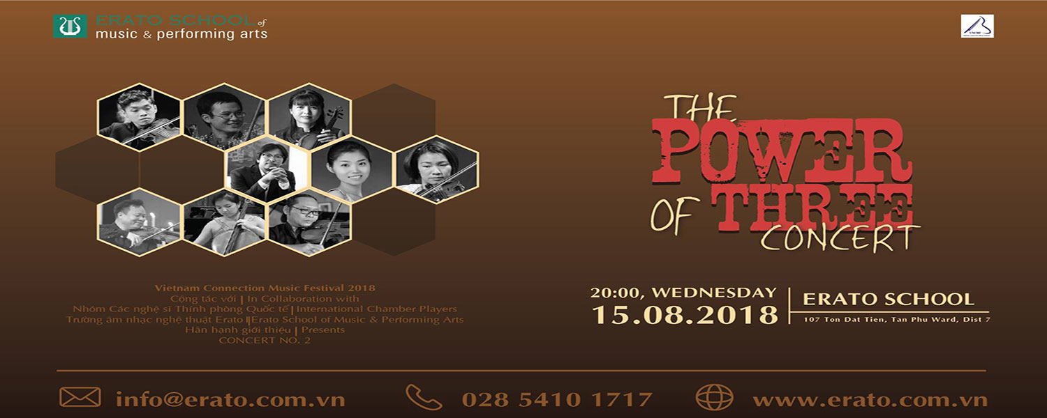 Trường âm nhạc và nghệ thuật Erato trân trọng giới thiệu buổi hòa nhạc: The Power Of Three - chương trình nghệ thuật trình diễn âm nhạc đặc sắc của các nghệ sĩ tài năng đến từ Mỹ, Đài Loan, Hàn Quốc và Việt Nam.