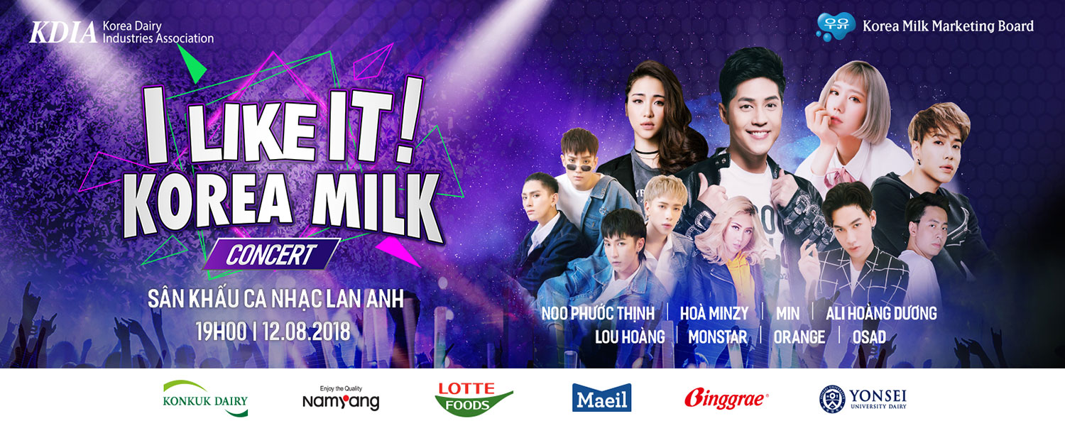 Một sự kiện âm nhạc vô cùng HOT mang tên I Like It. Korea Milk sẽ chính thức đổ bộ và hạ cánh tại sân khấu Lan Anh vào một đêm duy nhất ngày 12.08 tới đây. Sự kiện hứa hẹn sẽ mang đến cho giới trẻ Sài Thành một đêm nhạc bùng nổ cảm xúc từ những nghệ sỹ trẻ Việt đang được yêu thích nhất hiện nay như: Noo Phước Thịnh, Hoà Minzy, Min, Ali Hoàng Dương, LOU Hoàng, Monstar, chủ nhân bản HIT làm mưa làm gió Người lạ ơi Orange. OSAD…