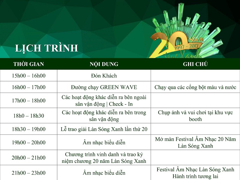 Tiếp theo sau Đường chạy xanh - Green Wave sẽ là Lễ trao giải Làn sóng xanh 2017 và tôn vinh các ca sĩ, nhạc sĩ qua 20 năm Làn sóng xanh Festival âm nhạc đặc biệt, phác họa lại hành trình 20 năm của những tên tuổi trong làng nhạc Việt, với những kết nối cảm xúc âm nhạc đặc sắc từ các bài hit trong bảng xếp hạng mang dấu ấn Làn Sóng Xanh trải qua 20 năm. Sự kiện hứa hẹn sẽ mang đến cho bạn những phút giây bùng nổ cùng âm nhạc với các nghệ sỹ tên tuổi hàng đâu tại V-pop như:
