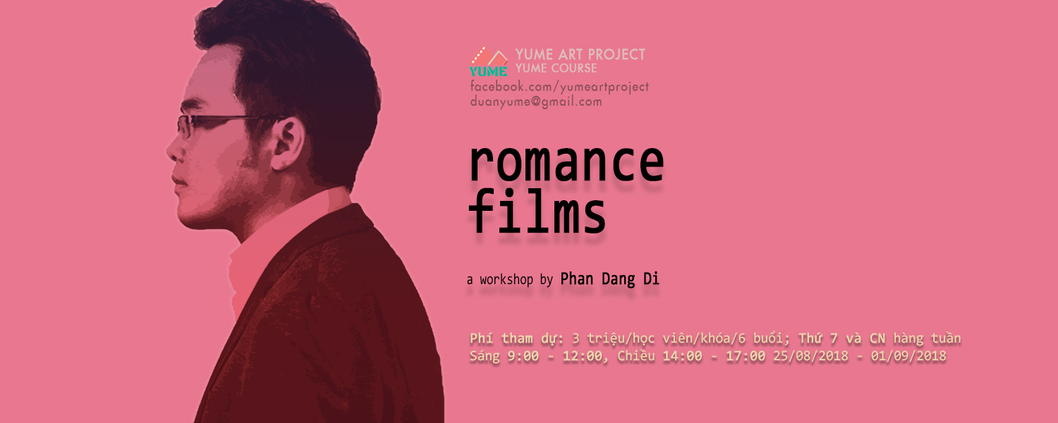 Tháng 8 này, nhà làm phim tài năng Phan Đăng Di, kết hợp cùng YUME Course, mang đến cho bạn 6 buổi chia sẻ cách làm một bộ phim theo phong cách Romance. Nắm bắt được tâm tư của hầu hết các bạn trẻ yêu điện ảnh vẫn đang loay hoay trong việc thể hiện câu chuyện phim bằng ngôn ngữ điện ảnh đích thực, hay nhiều đạo diễn phim Việt Nam lựa chọn thể loại Romance cho tác phẩm của họ nhưng chưa biết cách sử dụng hình ảnh, góc máy hợp lý để tạo cảm xúc cho khán giả, khóa học “Romance Films” này sẽ giúp các bạn tiếp cận với những phong cách làm phim nổi tiếng của các nhà làm phim Hongkong thập niên 90 như Trần Khả Tân, Vương Gia Vệ..., hay phong cách điện ảnh Hàn Quốc hiện đại, điện ảnh châu Âu... nhằm khắc phục những lỗi sai trong tư duy điện ảnh và học hỏi cách làm phim romance từ họ.