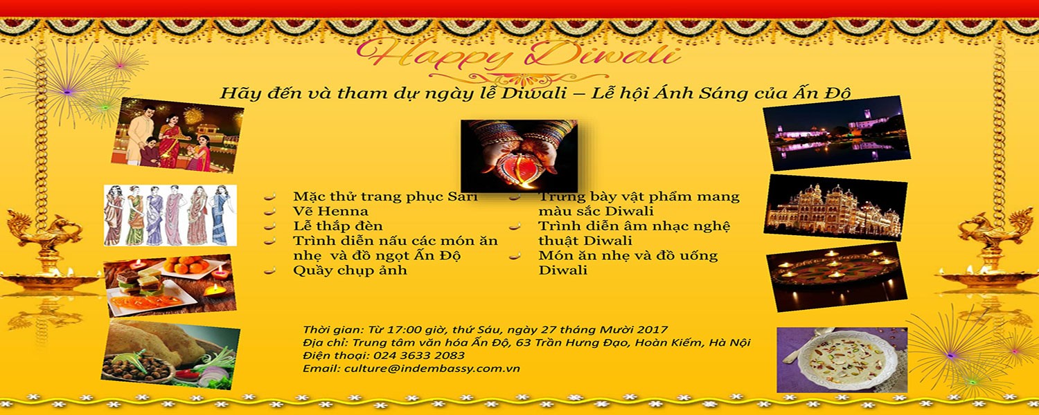 Đại sứ quán Ấn Độ tại Hà Nội sẽ tổ chức sự kiện Lễ hội Ánh sáng Diwali 2017 tại Trung tâm văn hóa Ấn Độ, 63 Trần Hưng Đạo, quận Hoàn Kiếm, Hà Nội vào lúc 17:00 giờ, thứ Sáu, 27 tháng Mười năm 2017.