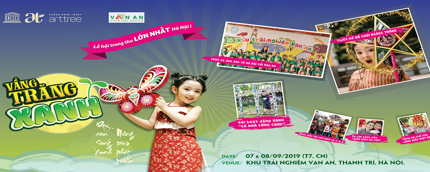 VẦNG TRĂNG XANH là 1 trong những lễ hội Trung Thu 2019 lớn nhất thủ đô Hà Nội cho các bạn nhỏ 4 – 15 tuổi, bao gồm một chuỗi các hoạt động tương tác – sáng tạo khám phá tại Khu trải nghiệm Vạn An. Đây chắc chắn là sự lựa chọn hoàn hảo mà phụ huynh đang mong mỏi và tìm kiếm một địa điểm vui chơi bổ ích cho cả bé và cha mẹ trong dịp ngóng trăng này. Khuôn khổ lễ hội sẽ có những hoạt động rèn luyện lòng dũng cảm của một nhà thám hiểm, đồng thời mài sắc khả năng sáng tạo của một người nghệ sĩ, đặc biệt là cơ hội để trẻ nghiên cứu các phương pháp sống xanh như các nhà khoa học thực thụ. Đây không chỉ là cơ hội hiếm hoi cho các bạn nhỏ phát triển trí não toàn diện thông qua các di sản truyền thống kết hợp hiện đại, mà cao hơn còn nâng tầm nhận thức của bé trong phương pháp sống xanh & bảo vệ môi trường. “Dạy con sống xanh – Nâng tầm phát triển”.