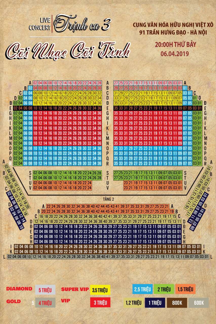 Giá vé: 600.000 - 800.000 - 1.000.000 - 1.200.000 - 1.500.000 - 2.000.000 - 2.500.000 - VIP 3.000.000 - SVIP 3.500.000 - GOLD 4.000.000 - DIAMOND 5.000.000