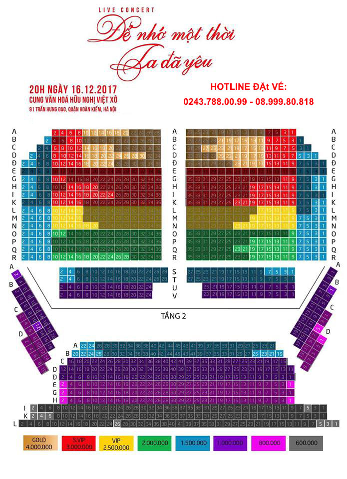 Dưới đây là sơ đồ vị trí ghế ngồi tại Cung văn hóa hữu nghị Việt - Xô