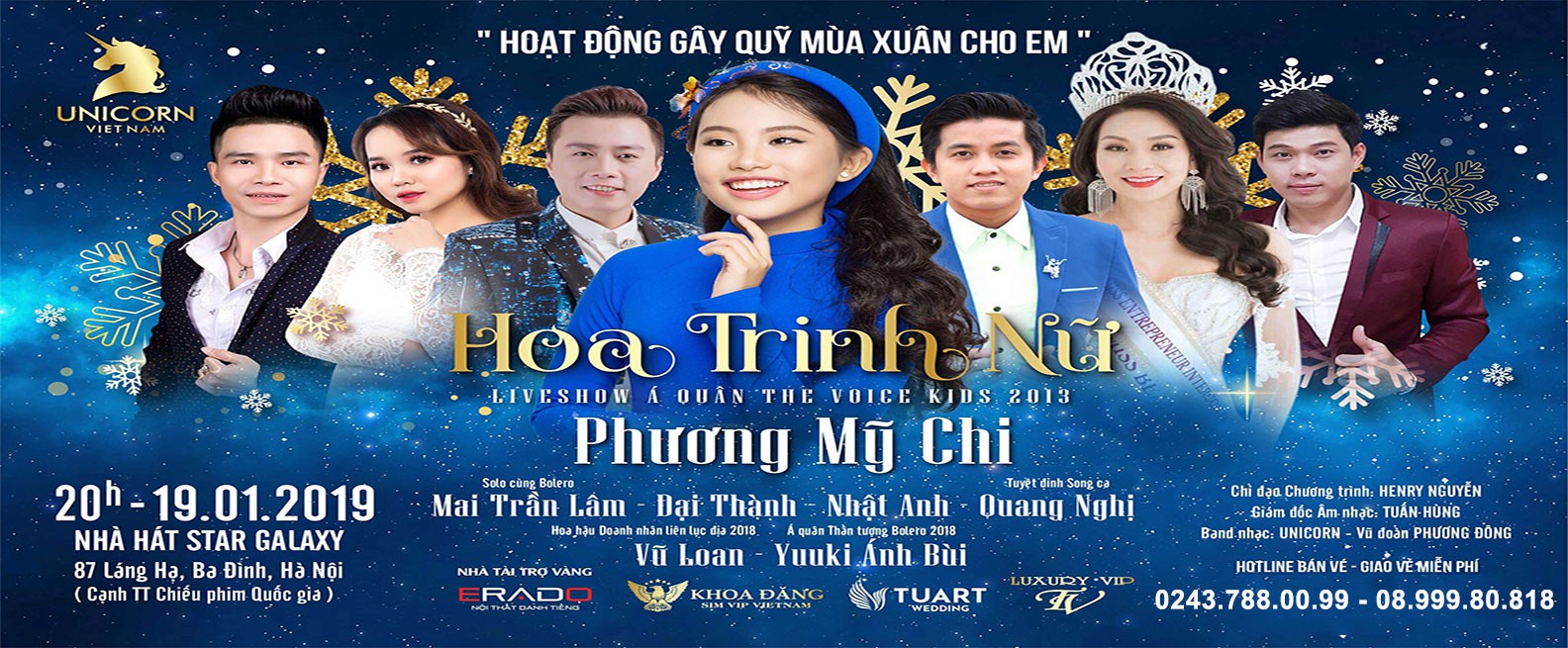 Sự kết hợp tuyệt vời của Á Quân The Voice Kid Phương Mỹ Chi và Á Quân Thần tượng Bolero Yuu Ki Ánh Bùi, cùng 4 Hoàng tử khách mời đặc biệt sẽ làm nên đêm nhạc tuyệt vời Chúc Mừng Năm Mới 2019 đồng thời cũng sẽ là hoạt động gây quỹ cho trẻ em nghèo có một cái tết ấm áp. Đêm nhạc Hoa Trinh Nữ sẽ được diễn ra tại Nhà hát Star Galaxy - 87 Láng Hạ. Đến với đêm nhạc, khán giả sẽ được chìm đắm trong một không gian âm nhạc hoàn toàn khác biệt bởi dàn âm thanh ánh sáng đẳng cấp. Hứa hẹn sẽ mang đến cho khán giả những trải nghiệm vô cùng tuyệt vời.