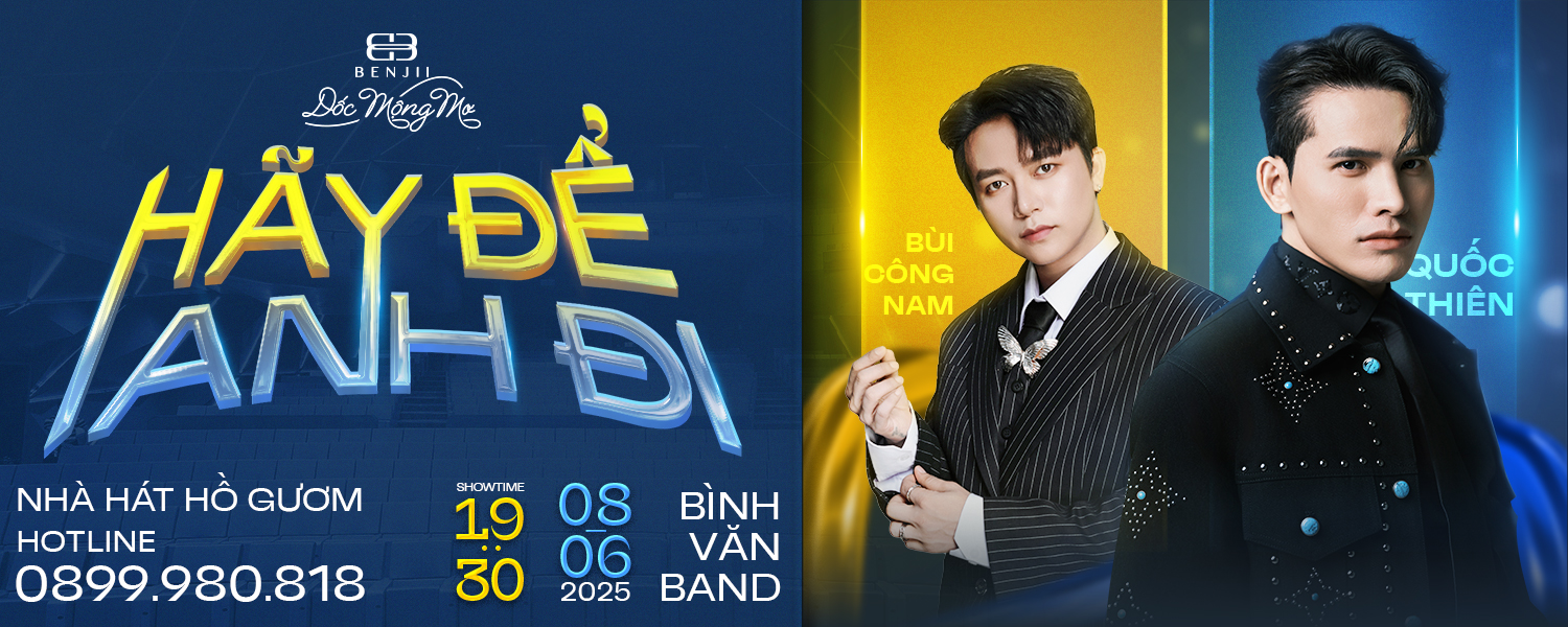 Vào ngày 08.06.2025, tại không gian sang trọng và đậm chất nghệ thuật của Nhà Hát Hồ Gươm, khán giả yêu nhạc sẽ có dịp sống trọn trong cảm xúc với đêm nhạc Quốc Thiên - Bùi Công Nam: Hãy để anh đi – một chương trình đặc biệt kết nối giọng hát và trái tim.