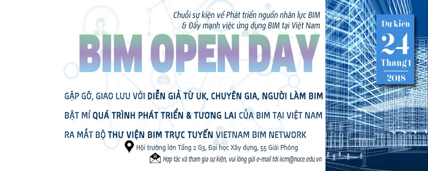 Để thực hiện đề án “Phát triển nguồn nhân lực BIM ở Việt Nam thông qua việc xây dựng và thực hiện các khóa đào tạo chuyên môn về BIM và sự hợp tác bền vững với các doanh nghiệp/ngành xây dựng”, vào ngày 23/1/2018 tới đây, sự kiện “BIM OPEN DAY” với chủ đề “Đẩy mạnh việc ứng dụng BIM tại Việt Nam và ra mắt bộ sản phẩm Vietnam BIM Network” sẽ được tổ chức tại Hội trường lớn của Đại học Xây Dựng.